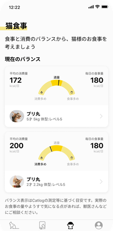 - 愛猫ごとの食事 / 消費のバランス把握で、健全な食事量のコントロールに